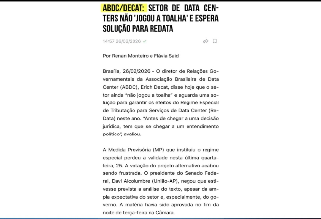 Nesta semana, o diretor de Relações Institucionais, Erich Decat, concedeu entrevista ao Broadcast/Estadão, analisando os possíveis caminhos para o Redata avançar no Senado.